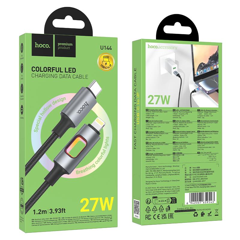 HOCO U144 ΚΑΛΩΔΙΟ ΦΟΡΤΙΣΗΣ TYPEC-LIGHTNING, 1.2M, 27W, ΜΑΥΡΟ